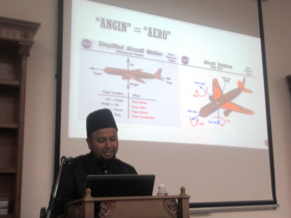 Oh. Saya sudah pergi jauh ke hadapan rupanya. Slaid tadi lebih pada mukadimah menunjukkan bidang pengkhususan beliau, belum sampai pada penerangan panjang lebar. Cuma dalam mencari dan mencipya bentuk terbaik bagi pesawat turut diambil kira adalah bahan atau material bagi membuat pesawat. Ada bahan yang kukuh tapi menambah berat, ada pula yang ringan tetapi tidak kukuh. Ada yang ringan dan kukuh tetapi menimbulkan masalah lain seperti mudah disambar petir lalu menyebabkan kerosakan peralatan elektronik di dalam kapal terbang. Maka dimasukkan kisah Zulkarnain dalam Al-Quran sebagai seorang yang tahu ilmu kejuruteraan struktur material ataupun bahan berdasarkan ayat-ayat dan surah berkenaan.